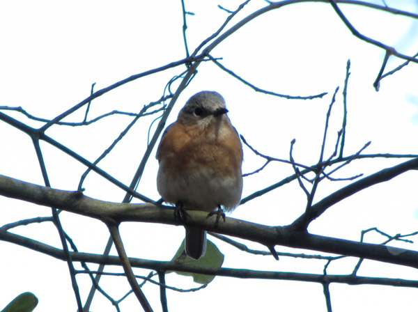 And finally, just before I reached my car, I noticed a commotion across the road. A large, mixed flock of warblers, chickadees, and other small birds flitted through the underbrush, staying long enough for me to catch a single frame of bluebird.