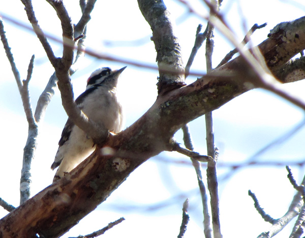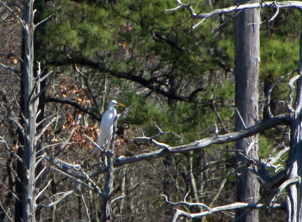 The day was remarkably warm, and I couldn’t resist a walk in the park. Neither could anyone else, it seemed, because the parking lot and trails bustled with walkers, joggers, and bicyclists. Needless to say, most of the park’s wild residents were in hiding. Even so, this downy woodpecker lingered near the road, and an egret paused at my camera’s most distant limit.
