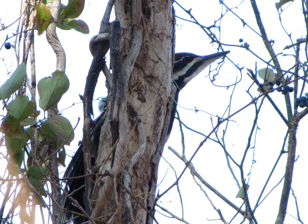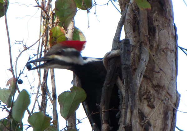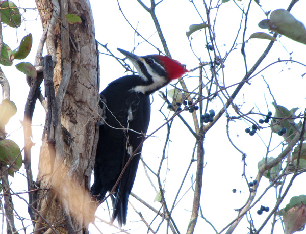After they moved on, I hesitated, as I always do when it’s time to leave. My reluctance was rewarded when a pileated woodpecker flashed by and lit just a few yards away. She and I spent a few curious moments sizing each other up, then she went ahead with her foraging as I fumbled with my camera.
