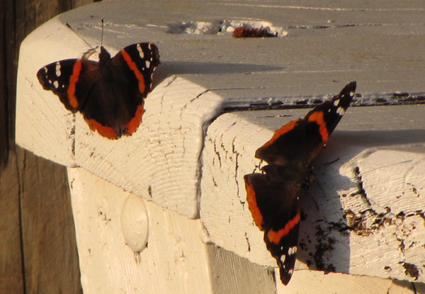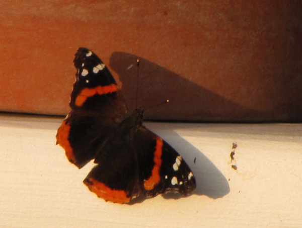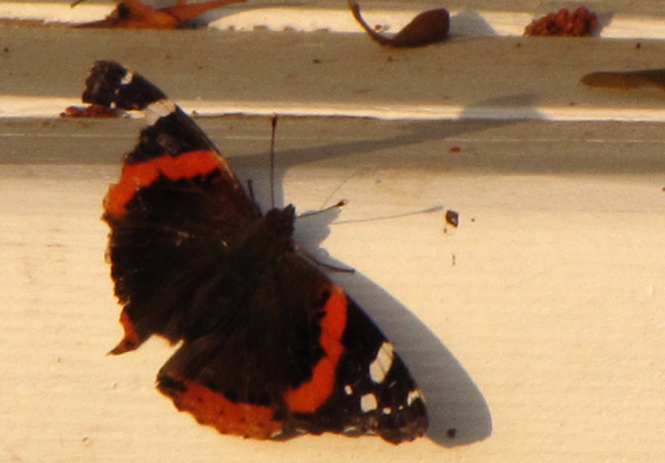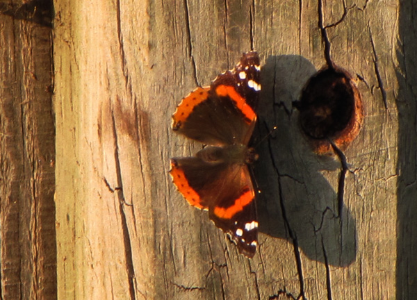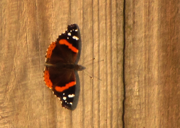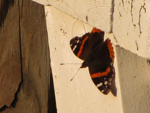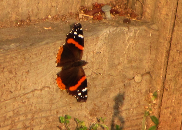 The red admiral party ended as the sun sank lower. The yard cooled, wings folded, and aggressions subsided. Once the fence was completely in shadow, the butterflies disappeared. I don’t know where they went, but within a matter of minutes they were gone.