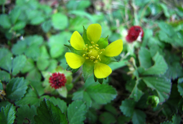 This weed has always grown in our yard, but I never bothered to look it up because I assumed it was wild strawberry. The little red fruits seemed so distinctive. Yesterday, as I searched for a link to include with this post, I realized that the yellow flowers are all wrong. Wild strawberry should have white flowers. After reading more online and consulting my old wildflower guide, I now believe this is Indian Mock-Strawberry.