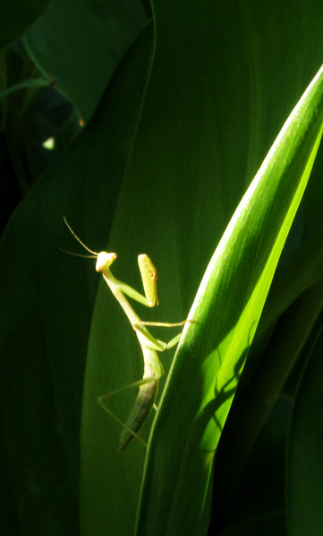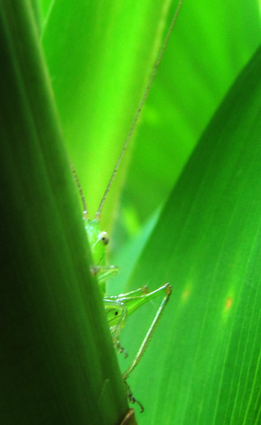 While chasing this praying mantis through the ginger lilies, I stumbled across a young katydid. Both creatures were very wary of the camera. It didn’t help that I tend to be too clumsy for stealth.