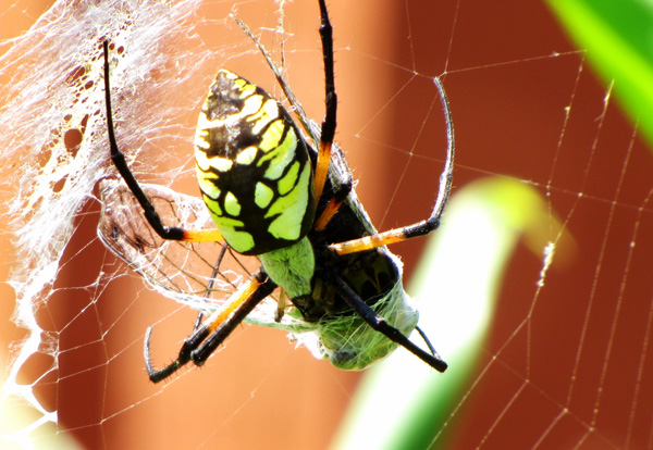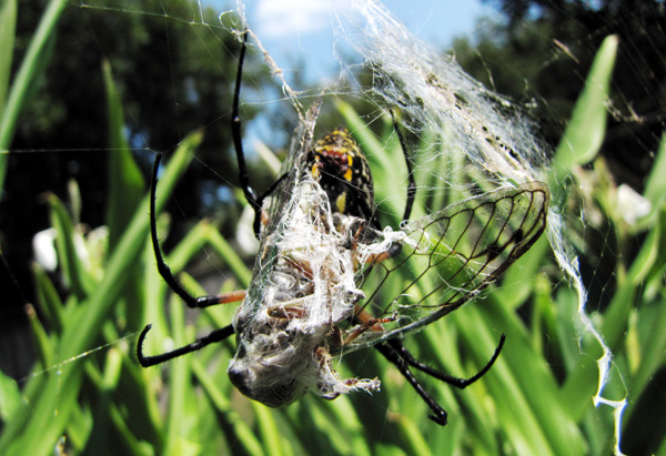 Thanks to our mild winter and productive summer, the spiders’ webs are never empty. They eat and grow, eat and grow, molting over and over again as the summer wears on. Now they are giants, far larger than any of the yard’s June bugs.
