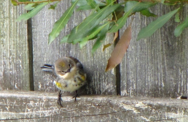 A sudden gust of wind forced one of the warblers to make an emergency landing on the fence this morning. He stayed there a while, fluffing his feathers and preening. His behavior reminded me of our cats, who cover any awkward step or fall with a bout of elaborate grooming, as if to say, “I meant to do that. Now, a little privacy? As you can see, I’m bathing…”