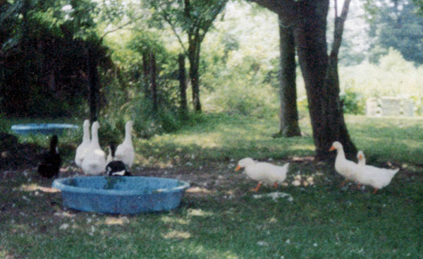 5 The wading pool was the closest thing they had to a pond. A second blue plastic wading pool, visible in the background, was in the dog pen and helped our dogs stay cool. The second pool also kept the dogs from digging under the fence because they wanted to play in water. (Click here to go back.)