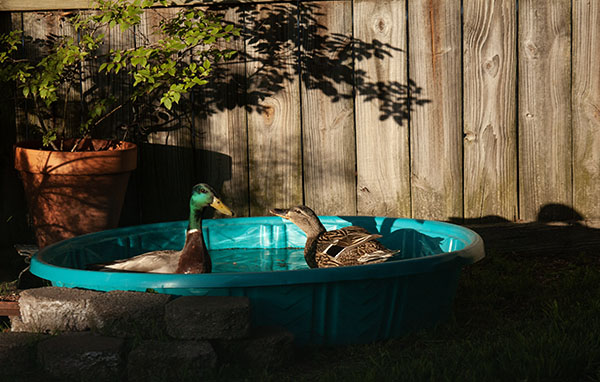 Hoping to lure the mallards away from the pond for at least a few hours each day, I purchased a blue plastic wading pool (definitely a theme in my lifelong efforts to keep waterfowl happy) and an extra bag of wild bird feed. Pool and feed in hand, I set up a duck station near the fence in our Virginia back yard, including steps for easy entry into the pool. Then I herded the mallards out of the pond and toward the pool.