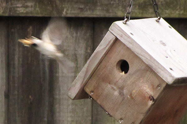 Thursday a lone chickadee decided to do a little spring cleaning in one of the wren houses.