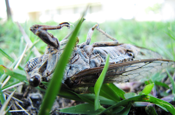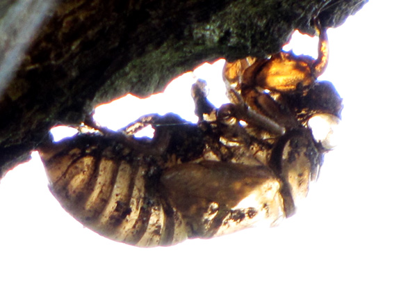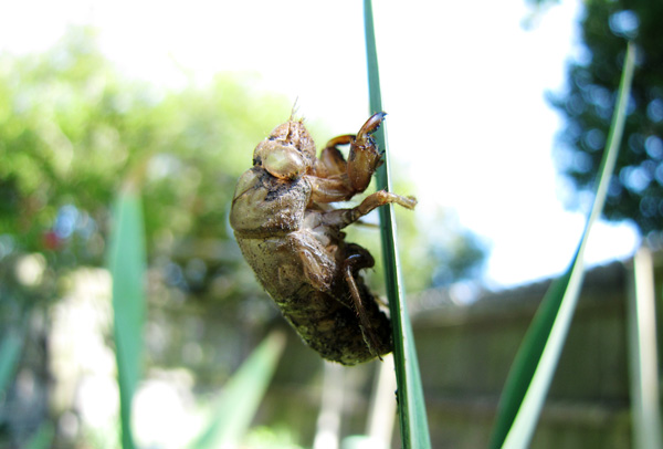 The yard is littered with cicada molts. Dozens of them on the fence, in the irises, in the roses, and hanging from trees. They fall into cobwebs and sway in the breeze. Then the wind sweeps them away, making room for new waves of emergence.