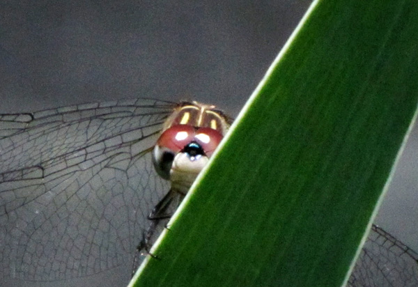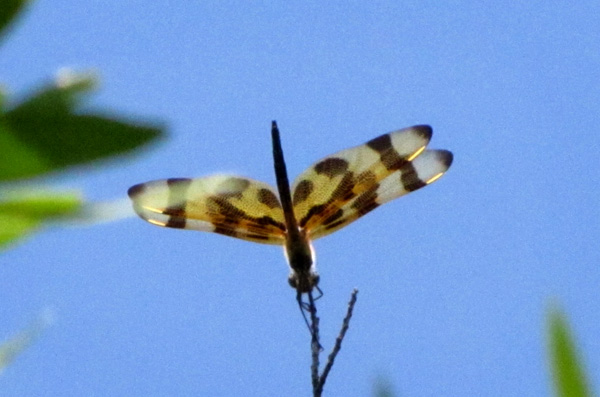 (At first glance, the next dragonfly seemed to be another Halloween Pennant, but the camera’s zoom function revealed inconsistent wing patterns. After consulting a few online resources, I believe this is either a female Common Whitetail or a Twelve-Spotted Skimmer. Please comment if you can correct or confirm my identifications!) [Update added June 30: Possibly a Painted Skimmer, see comment from Gillian.]